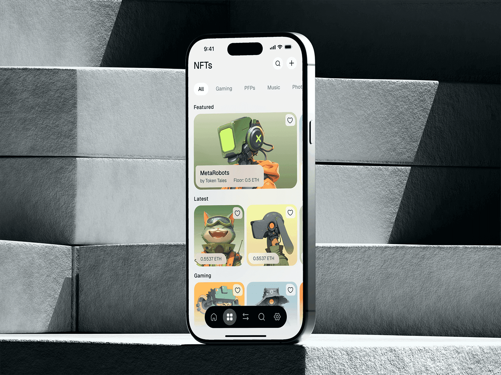 The NFTs screen showcases Featured and Latest collections, including standout assets like MetaRobots by Token Tales with a listed floor price of 0.5 ETH, alongside playful and colorful character NFTs. Categories such as Gaming, PFPs, Music, and Photography allow users to filter collections quickly. A sleek top search bar and a familiar bottom navigation menu provide effortless access to key wallet features like home, transactions, and settings.